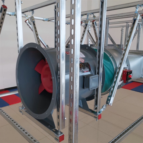 暖通局部:(1)管道不應穿過抗震縫,當必須穿梭時,須在抗震縫兩邊各裝一個柔性管接頭或在通過抗震縫處裝置“門”形彎頭或設伸縮節;(2)鍋爐房、制冷機房、熱交換站內的管道應有堅固的側向跟縱向抗震支撐,多根管道共用管廊支架或管徑≥300mm 的單根管道支吊架宜采取門型管廊支架;(3)矩形截面面積大于即是0.38m2 跟圓形直徑大于即是0.70m 的風道可采取管廊支架,管廊支架的設置跟設計應合乎本標準第8章的請求。(4)防排煙風道、事變通風風道及其設備應采取管廊支架。