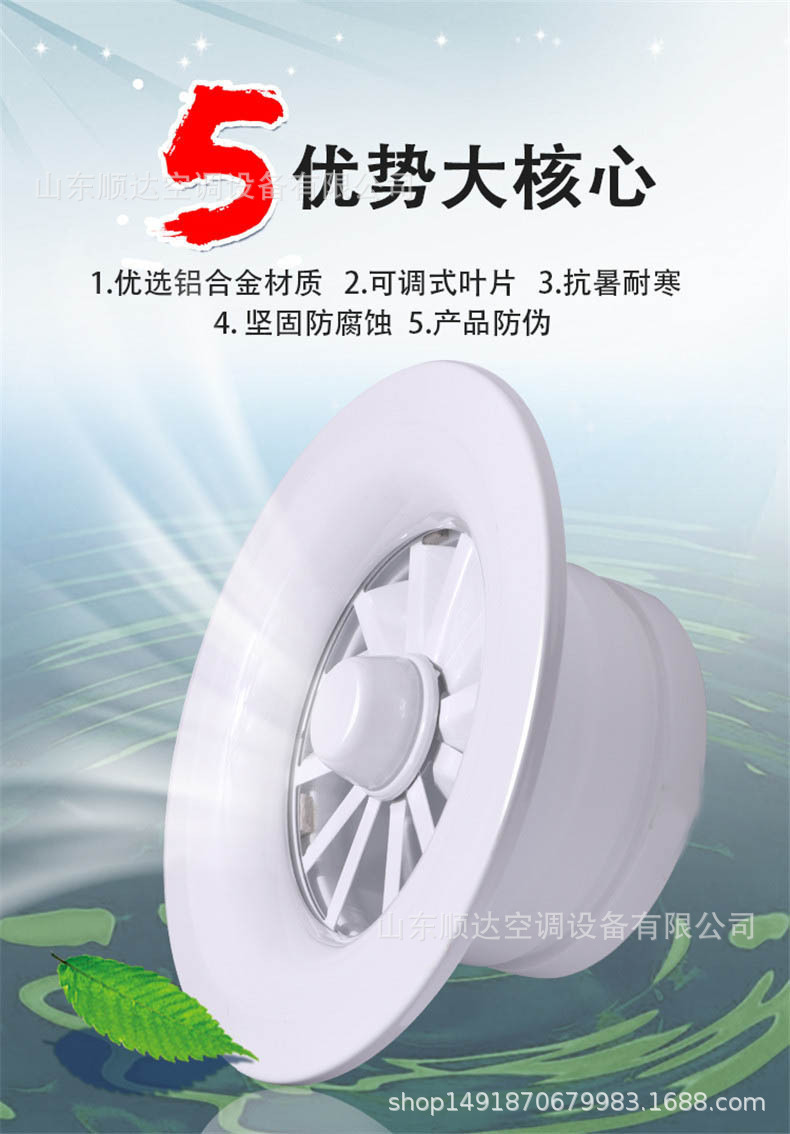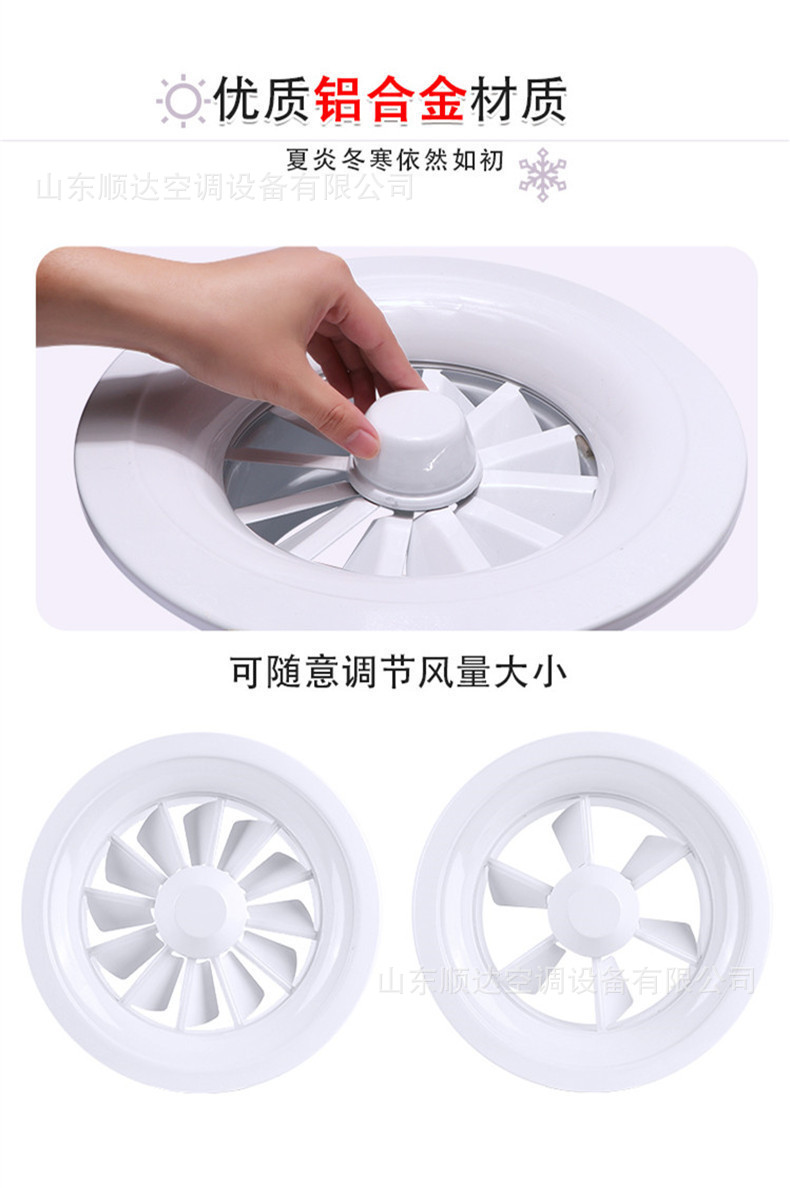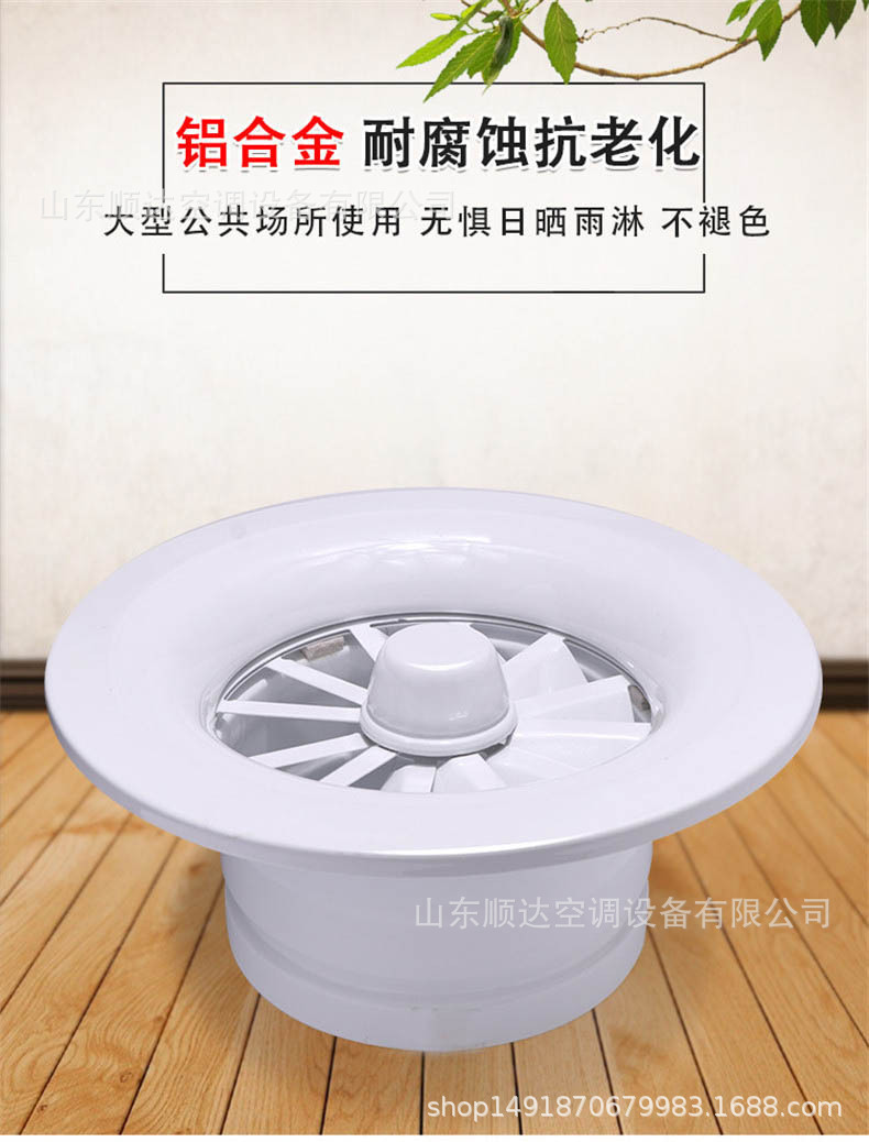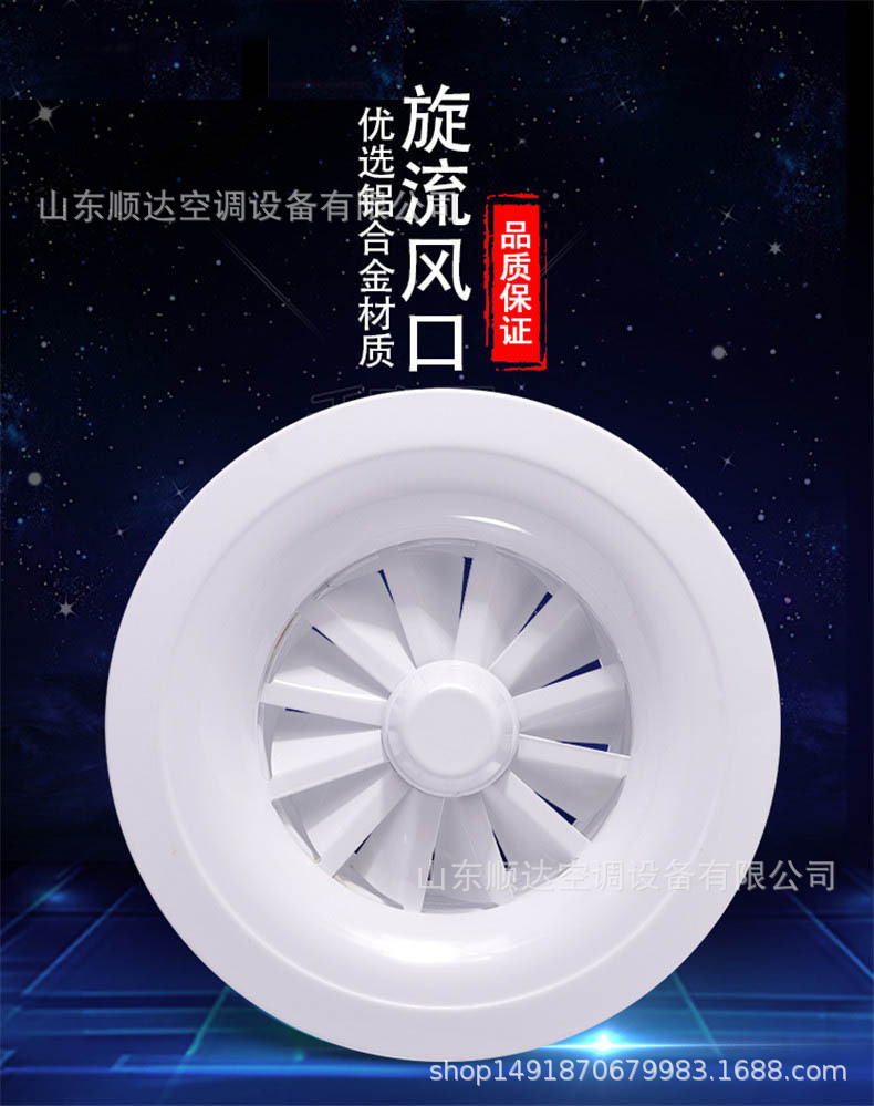 旋流風(fēng)口是空調(diào)系統(tǒng)中的一個排風(fēng)工具。在空調(diào)通風(fēng)系統(tǒng)中可用作大風(fēng)量,大溫差送風(fēng)以減少風(fēng)口數(shù)量,安裝在天花板或頂棚上,可用于3米以內(nèi)低空間,也可用二種高度大面積送風(fēng),高度甚至可達10米以上。
